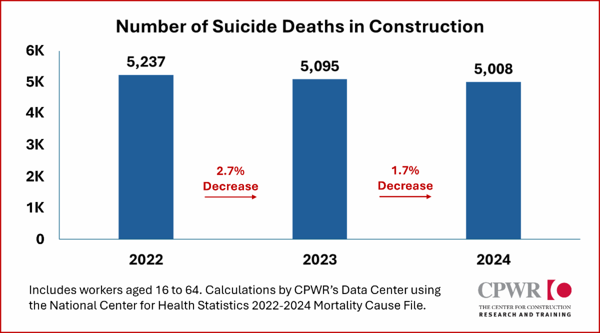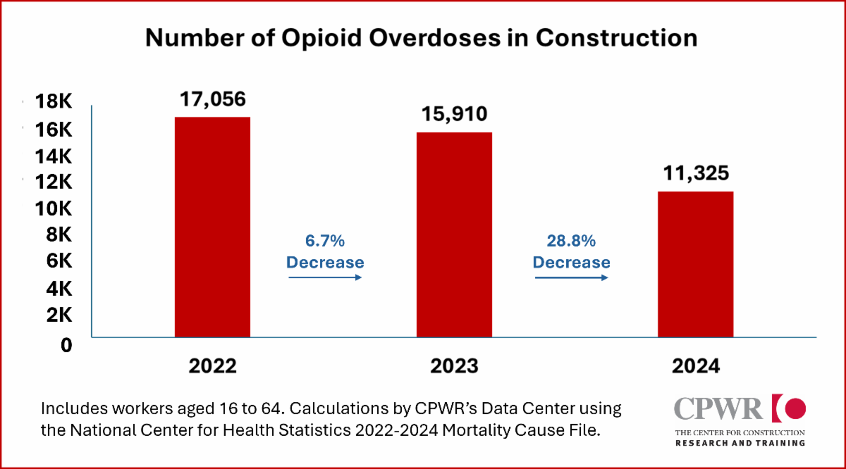 Among construction workers aged 16-64, drug-related overdose deaths dropped 28.8% from 2023 to 2024. The number of deaths decreased from 15.9 thousand (K) to 11.3K, and the overdose death rate fell from 135.0 to 94.8 per 100,000 workers. Although 11,000 workers in our industry dying in a year from an overdose is still much too high, the reduction marks meaningful progress and good news!